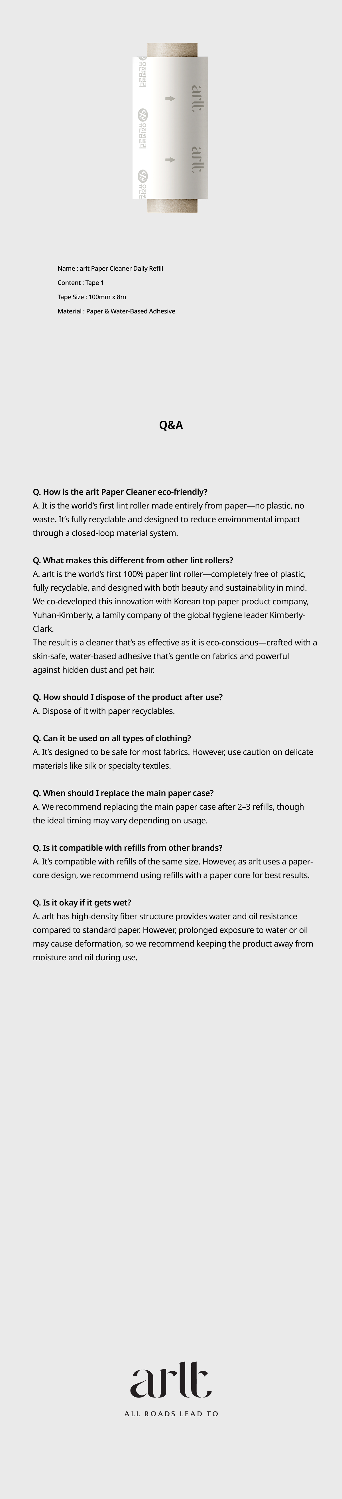 The arlt Paper Cleaner is an innovative lint remover that embodies the cycle of nature and the value of sustainability. Unlike traditional plastic products, every piece of this cleaner is made from paper, allowing it to return to nature after its lifecycle ends. This eco-friendly product reflects arlt's brand philosophy and our sincere commitment to pursuing a sustainable lifestyle. Making a small change by switching your daily lint cleaner to paper can have a significant positive impact on your life and the environment. The Paper Cleaner offers high-performance dust and lint removal, and it can be recycled as paper after use. With a love for nature, arlt brings a small change to your everyday life that makes a big difference.
